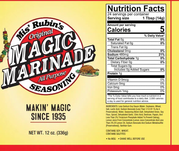 The Steak Marinade is a delicious blend of our unique spices that adds a magical flavor to beef, pork, & wild game. Miss Rubin's use a premium soy sauce (Kikkoman – made in USA) as a base & include their time-tested seasoning blends, rather than a Corn Syrup base or cheap soy sauce.The result is lower sodium and better flavor/product with Mis' Rubin's Marinades.