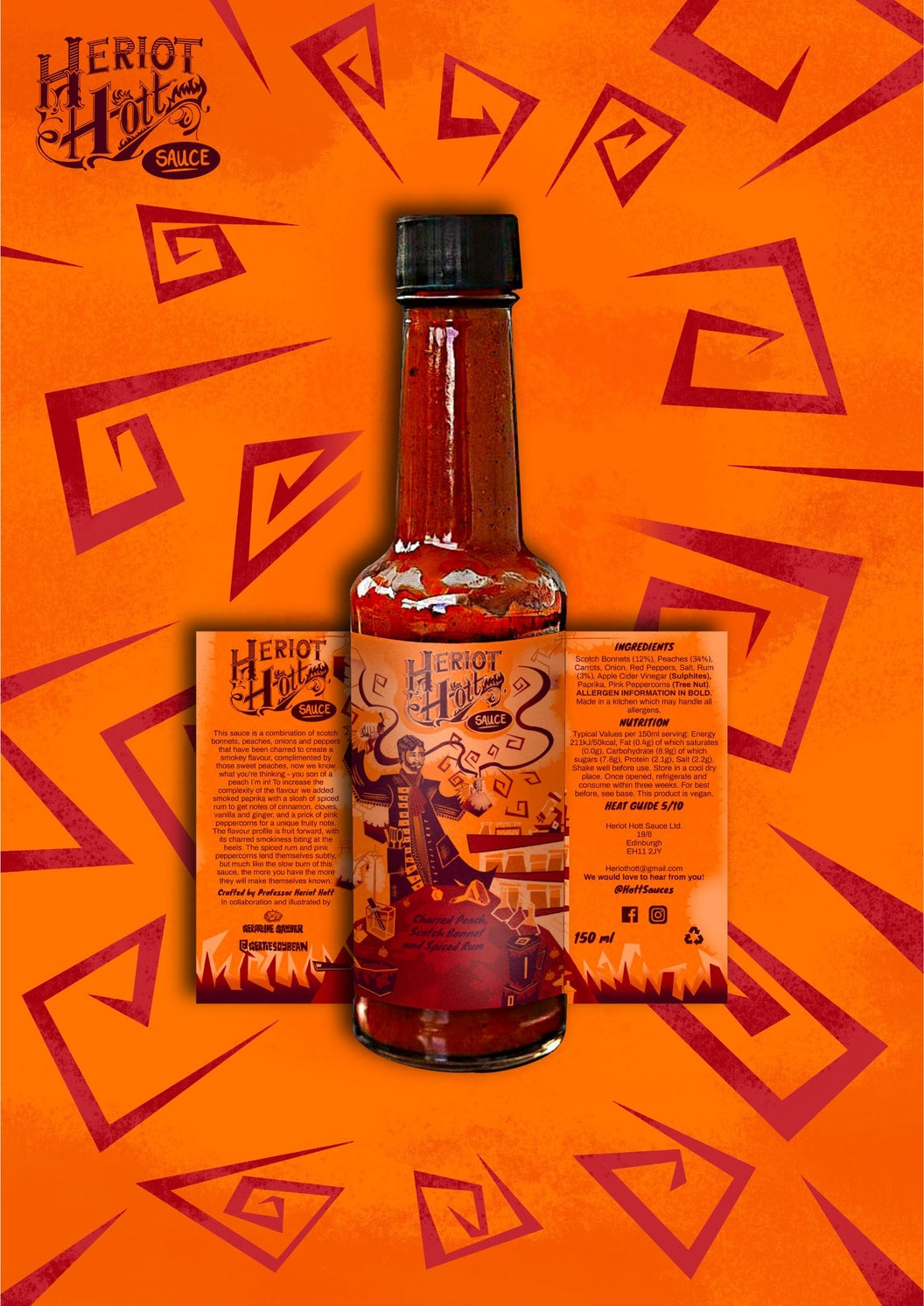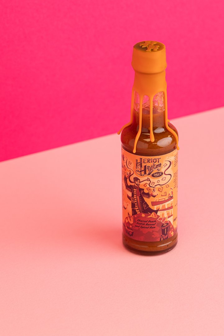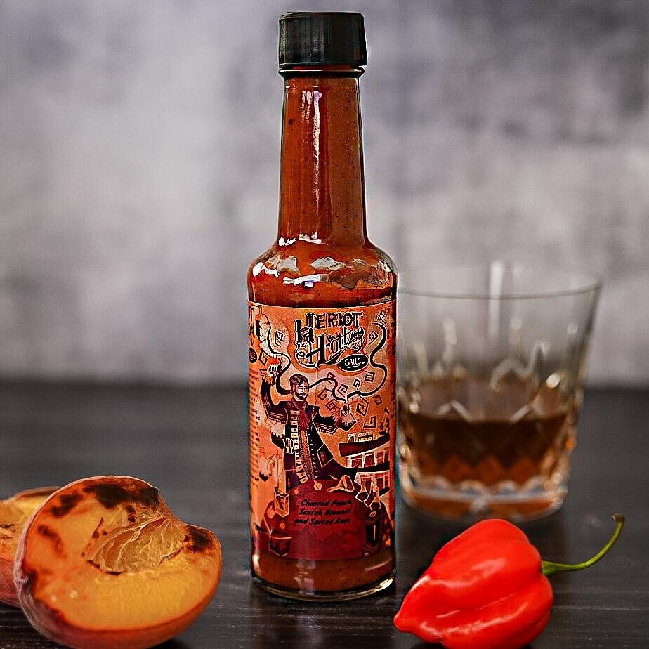 Heriot Hott, the renowned Scottish Hot Sauce company, proudly presents its Charred Peach, Scotch Bonnet, and Spiced Rum hot sauce, a vegan culinary creation that masterfully blends the sweetness of charred peaches with the fiery kick of Scotch Bonnet peppers, all elegantly finished with a hint of spiced rum. This unique sauce strikes a delightful balance between sweet, spicy, and boozy flavors, offering a heat level that's accessible yet thrilling, rated at a moderate 5/10.