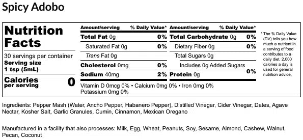 Ingredients: Pepper Mash (Water, Ancho Pepper, Habanero Pepper), Distilled Vinegar, Cider Vinegar, Dates, Agave Nectar, Kosher Salt, Garlic Granules, Cumin, Cinnamon, Mexican Oregano