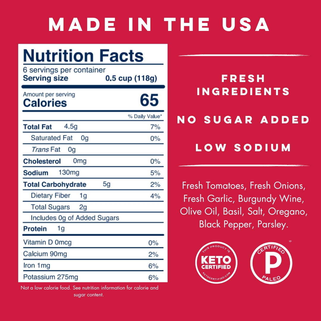 - Crafted With Fresh Tomato, Onion, Garlic, Pepper, & Basil.