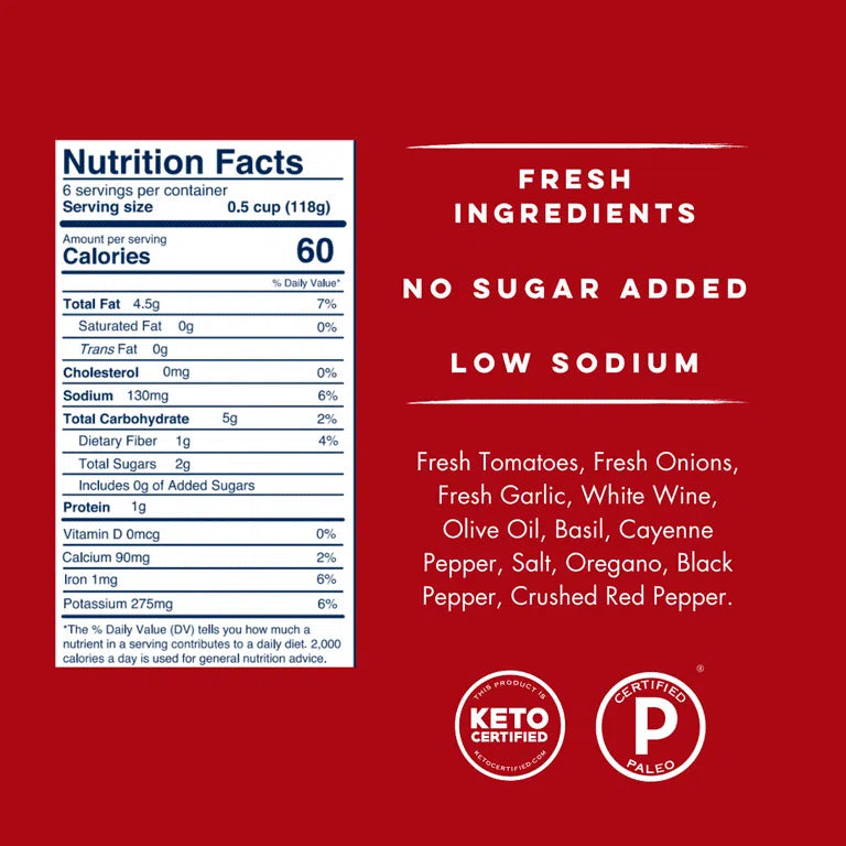- Crafted With Fresh Tomatoes, Onions, Garlic, Pepper, & Basil